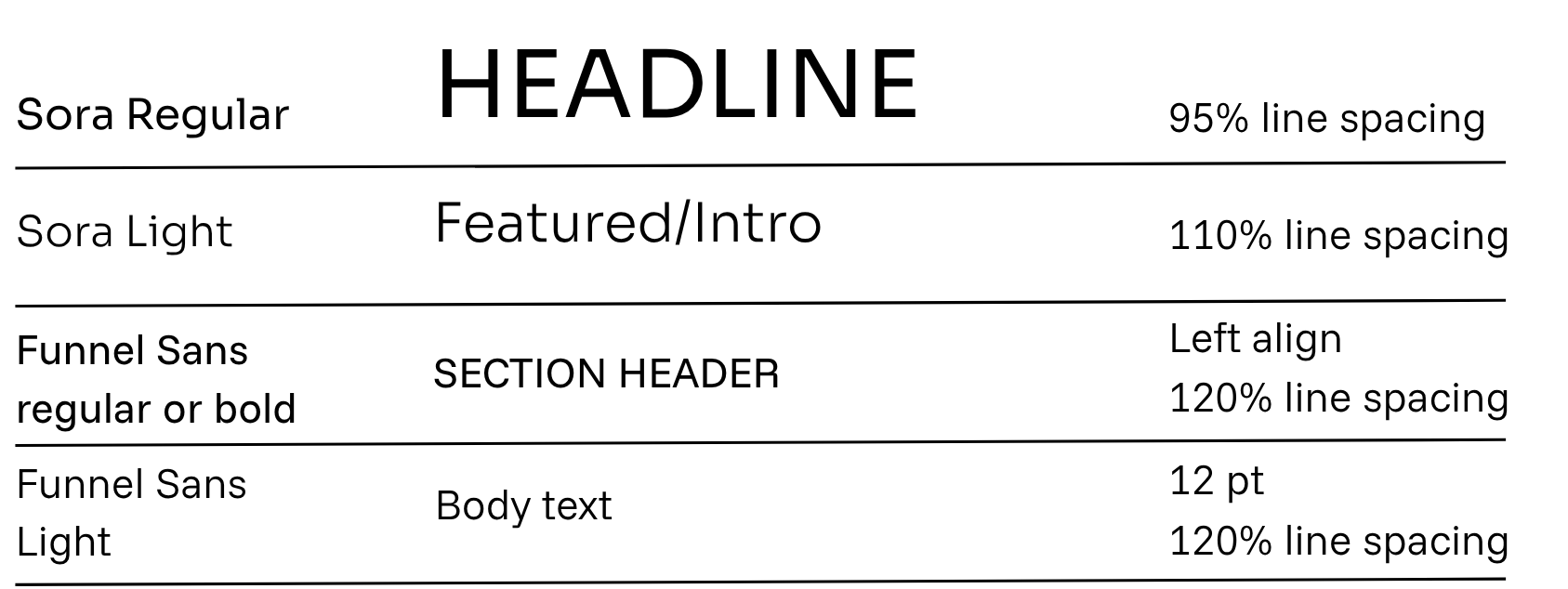 Spine uses two distinctive sans-serif typefaces that deliver excellent legibility across mediums. Both are open access Google fonts. Upper-case Sora Regular 0.95 spacing for headline text and lowercase Sora light 1.10 spacing for features/intro text.